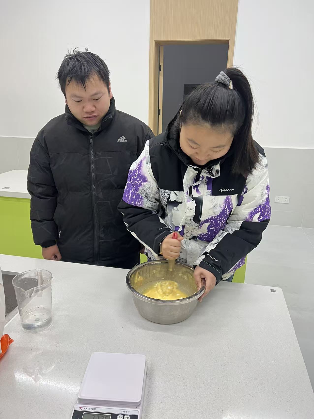 烘焙课堂上,老师化身耐心的“引路人”,根据学生的认知水平和动手能力,制定了分层教学方案。从认识面粉、鸡蛋、黄油等食材,到学习称量、搅拌、塑形等基础步骤,每一个环节都讲解得细致入微。对于手部精细动作发展较慢的学生,老师手把手地指导他们握打蛋器、揉面团;对于学习能力较强的学生,则鼓励他们尝试创意装饰,给饼干画上可爱的表情,给纸杯蛋糕点缀彩色糖珠。